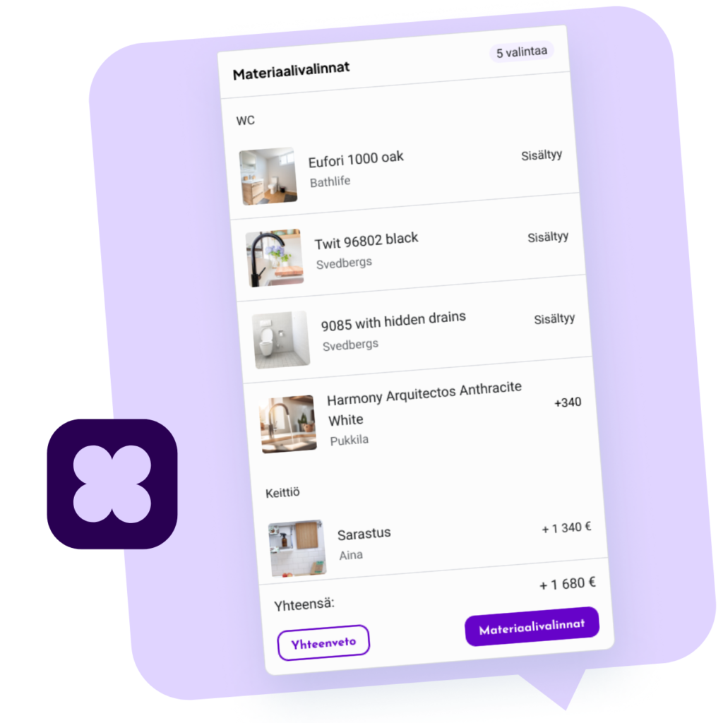 Ota materiaalivalinnat haltuun Homerunin avulla. Asukkaat tekevät valintansa itse, ja sinä saat valmiit huoneistokortit ja tilauslistat suoraan järjestelmästä. Hallitse asukasmuutokset helposti ja läpinäkyvästi. Ohjelmistomme vähentää virheitä ja säästää aikaa sekä sinulta että asukkailta. Lähetä valmiit huoneistokortit sähköisesti allekirjoitettavaksi omistajille. Tavarantoimittajarekisterimme pitää huolen siitä, että tuotteet ovat aina ajan tasalla.