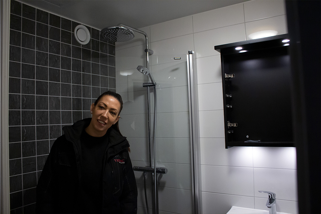 I Solna sträcker sig fastigheten högt över den snötäckta marken och den blå byggboden med Tepacs logga syns tydligt mot den vita snön. I det här huset gör byggbolaget just nu stambyten på 102 lägenheter där många av de boende bor kvar. Vi möter det självutnämnda ”Kontoret”, eller kontorsansvariga Jessica som hon egentligen heter, i dörren till byggboden och får ett varmt bemötande. Jessica har arbetat på Tepac i över åtta år och var med när företaget huserade i en liten källare. Sedan dess har bolaget vuxit från åtta anställda till dagens 25, en imponerande resa!